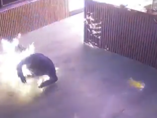 Ao atear fogo, as chamas rapidamente atingem a roupa do criminoso. Em pânico, o homem corre para fora do restaurante e chega a entrar no carro no qual havia chegado ao local. Percebendo que não era uma boa ideia, ele sai rapidamente do veículo e se esfrega no chão para se livrar das chamas. Só então ele bate em retirada.