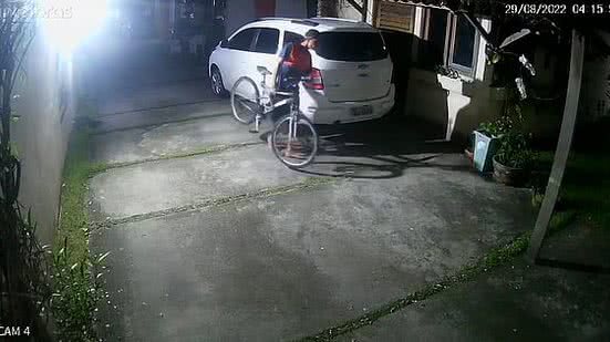As imagens mostram um homem furtando uma bicicleta e um cortador de grama depois de pular o muro do residencial; veja abaixo: