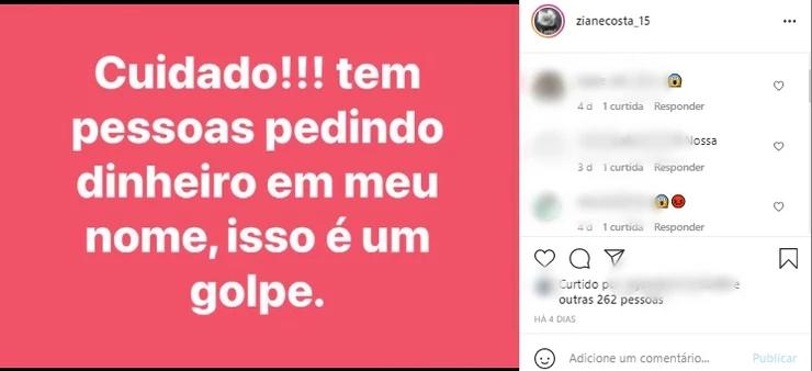 A prefeita Ziane Costa havia alertado, no início da semana, que pessoas usavam o nome dela pelo aplicativo de mensagens para pedir uma quantia em dinheiro. Ela também divulgou a informação por meio do Instagram. Veja abaixo: