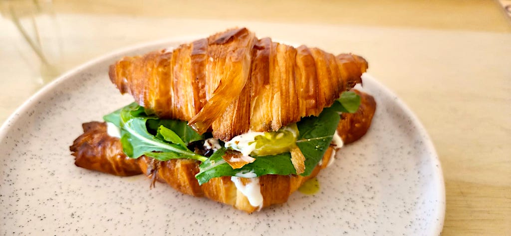 Croissant com recheio de carne de sol, maionese da casa, queijo coalho Timbaúba e picles de maxixe.