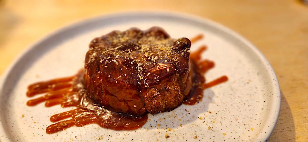 Damier, a mesma massa do croissant, com açúcar e canela, finalizado com caramelo salgado e farinha de castanhas.