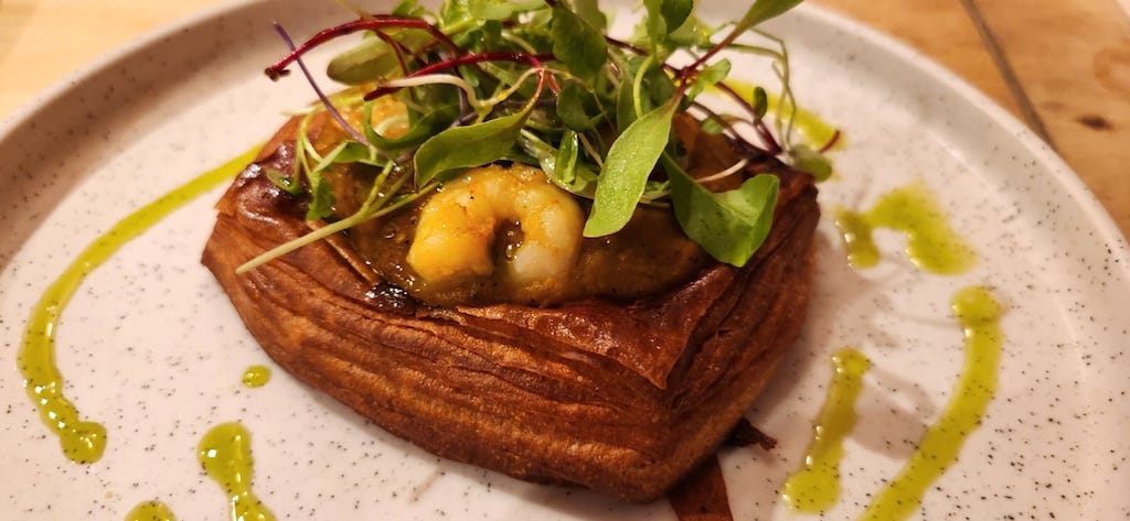 Vou voltar para provar: massa folhada com camarão e purê de abóbora feito com dendê e leite de coco