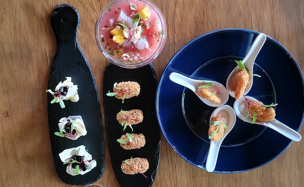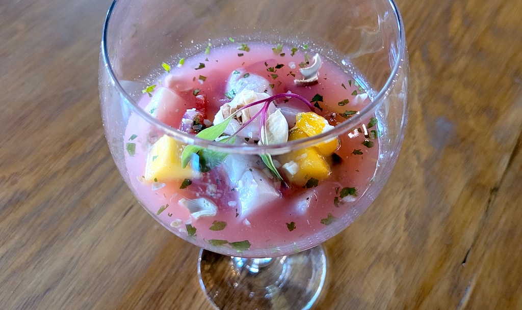 Ceviche Tropical: Peixe branco com manga, coentro, castanha de caju e perfume de limão siciliano