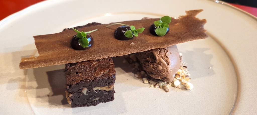 Chocolatudo, uma sobremesa composta por 100% de chocolate no brownie, sorvete, ganache e tuile com crocante de castanha de caju.