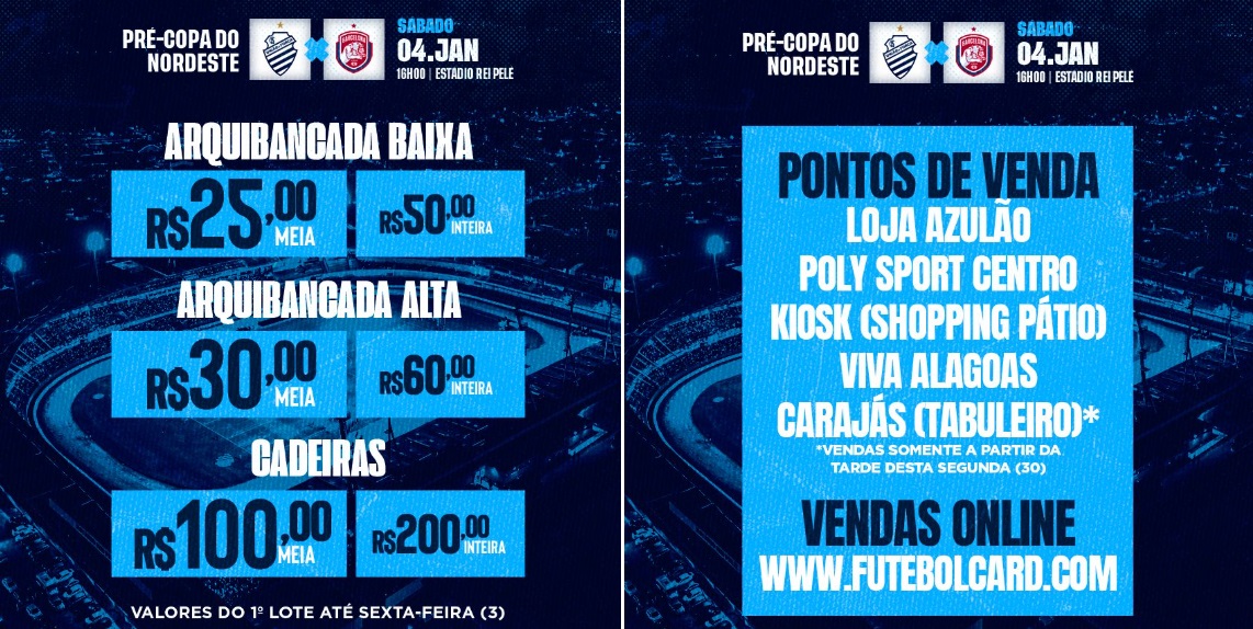 Pré-Copa do Nordeste - A Confederação Brasileira de Futebol enfim confirmou as datas e os horários dos jogos da fase eliminatória do Nordestão. O Azulão recebe o Barcelona-BA no sábado, 4 de janeiro, às 16h, no Rei Pelé, em Maceió. Os ingressos serão vendidos a partir desta segunda-feira, 30. Confira os valores e pontos de venda: