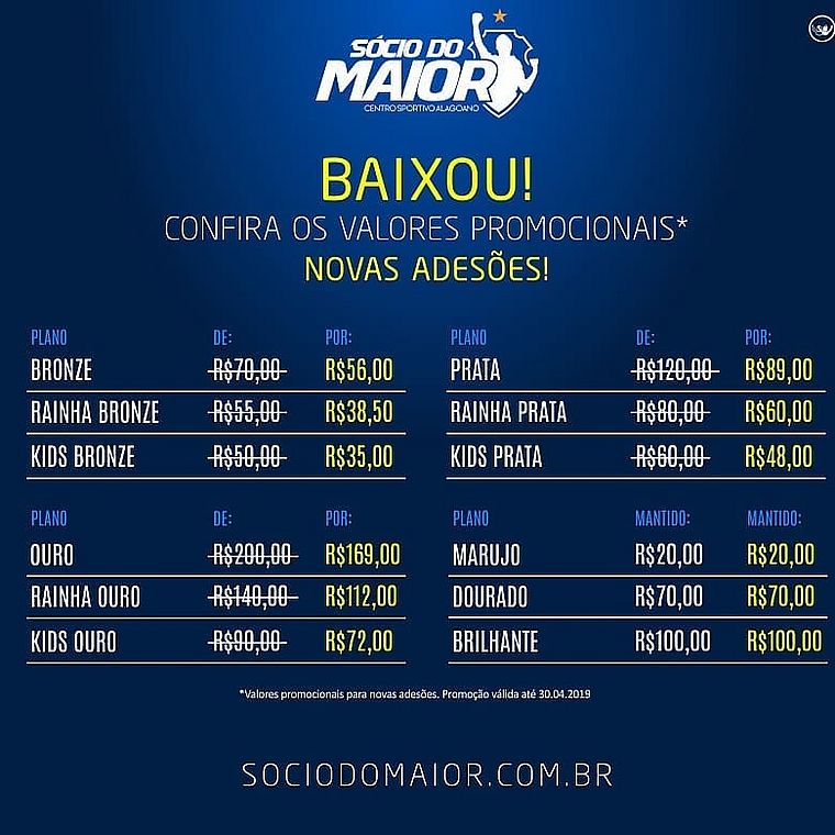 Os preços do programa de sócio torcedor tiveram baixas. A categoria Bronze, que dá acesso ao setor de arquibancada baixa nos jogos do CSA em Maceió, caiu de R$ 70 para R$ 56. Já a categoria Prata, referente ao setor de arquibancada alta, diminuiu de R$ 120 para R$ 89. A categoria ouro permite a entrada nas cadeiras especiais e foi de R$ 200 para R$ 169. Os preços promocionais são válidos até o próximo dia 30. Veja abaixo a tabela completa com as mudanças.