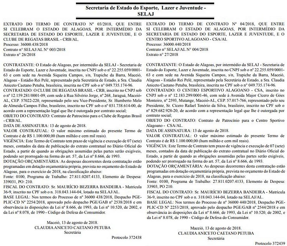 Os extratos apontam ainda que a dotação orçamentária são decorrentes de receita própria, previstas no orçamento estadual. A cota de patrocínio é cedida todos os anos aos clubes de Alagoas que disputam a Série B do Campeonato Brasileiro. O processo foi aberto dia 03 de abril, antes mesmo do incíniodo Campeonato Brasileiro, mas a liberação da cota só pode ser concluída após assinatura do contrato.