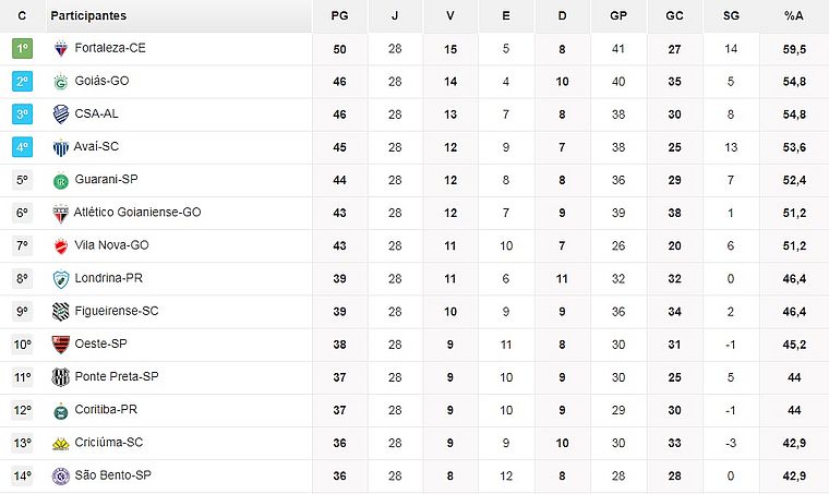 O Esmeraldino empatou com a Ponte Preta em Goiância, chegou aos 46 pontos e agora é o vice-líder, tendo 67% de chances de retornar à elite do futebol brasileiro. Logo atrás estão CSA (64%), Avaí (48%), Guarani (38%), Atlético-GO (35%), Vila Nova (31%), Londrina (8%), Figueirense (5%), Oeste (4%), Coritiba (3%), Ponte Preta (2%), Criciúma (1%) e São Bento (1%).