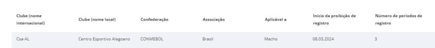 Em contato com o TNH1, o jurídico do clube informou que ainda não recebeu nenhuma notificação oficial da Fifa até o fechamento desta matéria. A entidade máxima do futebol, no entanto, já publicou a punição ao clube oficialmente no site, a qual cita que o CSA foi punido na última sexta-feira (8). Veja abaixo.