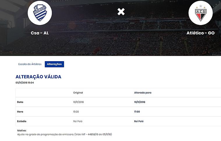 O duelo com o Atlético-GO teve o horário modificado. Anteriormente marcado para as 18h30 (horário de Alagoas) no próximo sábado (10), o jogo mudou para as 16h (horário de Alagoas). O dia da partida segue mantido para o sábado (10). O motivo da alteração, segundo a CBF, foi ajuste na grade de programação da emissora que detém os direitos de transmissão.