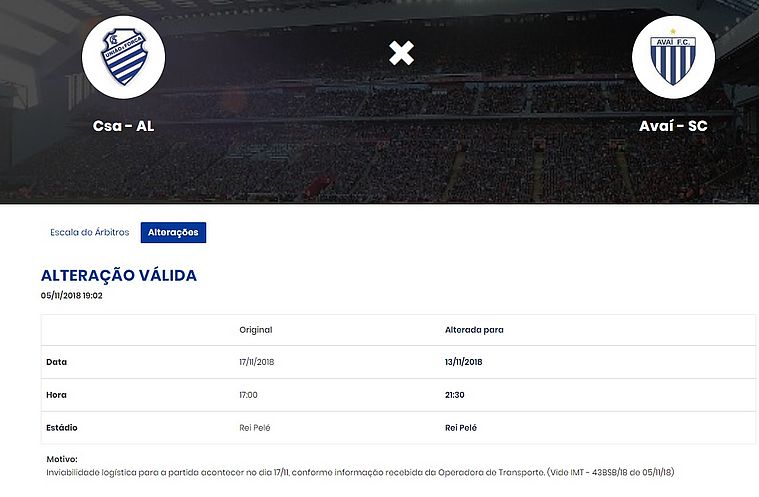 Já o confronto com o Avaí, segue agendado para as 16h (horário de Alagoas) do sábado (17). Como mostra a imagem abaixo, a CBF havia antecipado o jogo para a terça-feira (13), às 20h30 (horário de Alagoas), mas revogou a decisão ainda no início da noite.