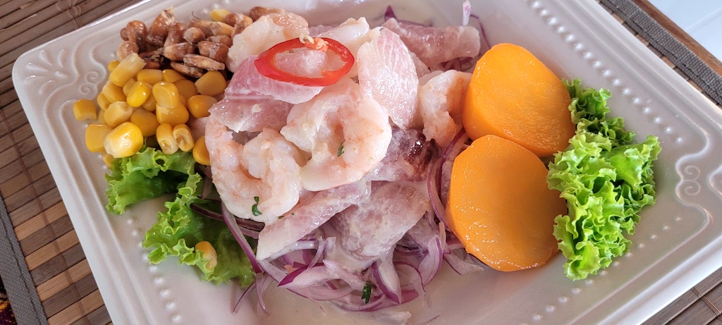 Ceviche Mixto com filé de peixe branco fresco, camarões, polvo e lula