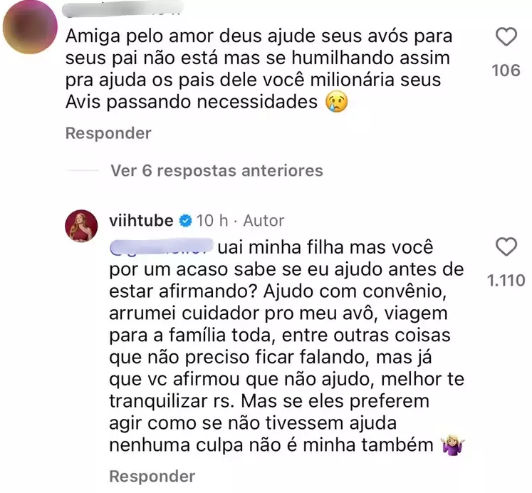 "Uai, minha filha, mas você por acaso sabe se eu ajudo, antes de afirmar? Ajudo com convênio, arrumei cuidador para o meu avô, viagem para a família toda, entre outras coisas que não preciso ficar falando. Mas já que você afirmou que não ajudo, melhor te tranquilizar (risos). Mas se eles preferem agir como se não tivessem ajuda nenhuma, a culpa não é minha também", respondeu.