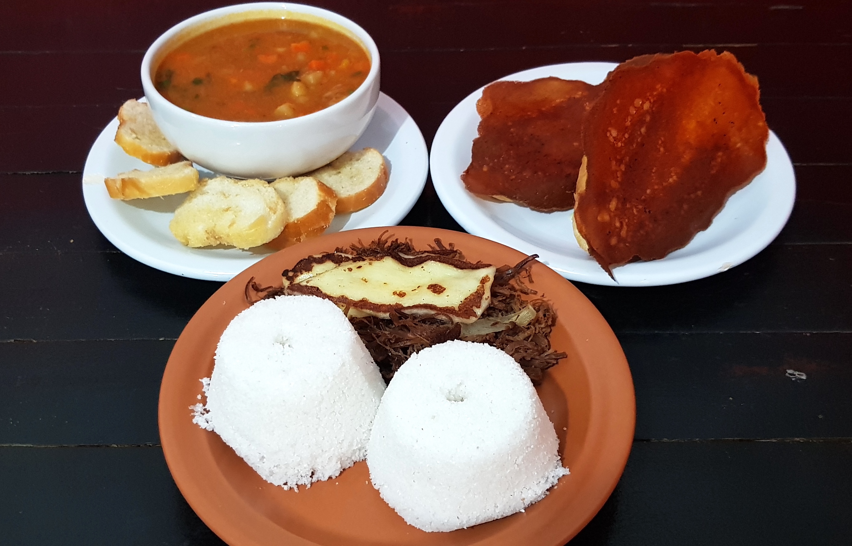 Tostex de queijo com recheio de carne de sol, sopa, cuscuz e tapioca