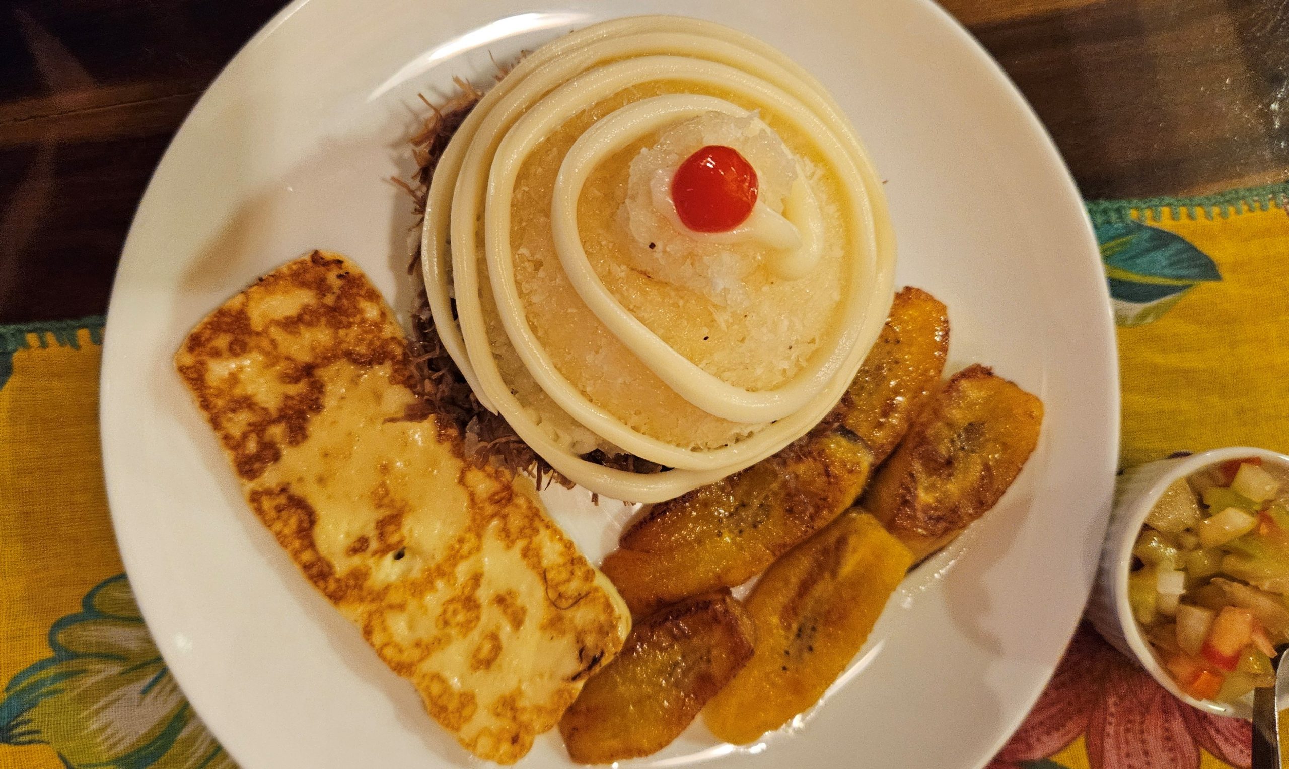 Cuscuz de macaxeira recheado com carne de sol, queijo coalho e banana da terra