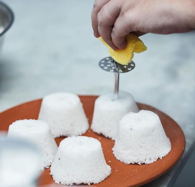 Porque esse cuscuz de arroz é bom? É artesanal, os grãos são secos, moídos até virar uma farinha fina, depois é misturado ao bagaço de coco e segue para cuscuzeira (modelo de dona Pureza). São quatro cuscuzeiras adaptadas numa panela, quando termina de colocar a última massa, o primeiro já está pronto. Sai quentinho e ganha um banho de leite de coco. Chega na mesa molhadinho, com um leve agridoce do leite de coco, mas é salgado e de tão delicado, desmancha no céu da boca.