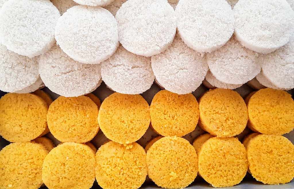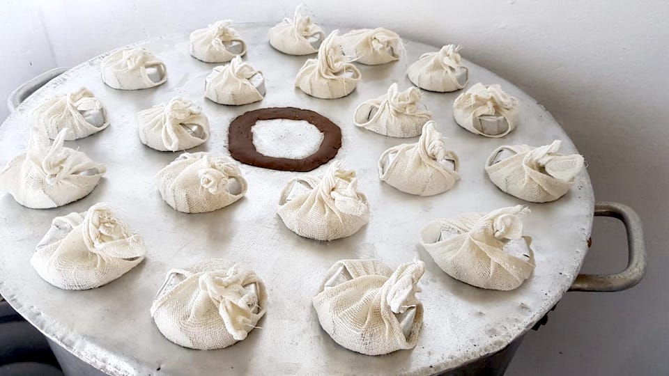 A cuscuzeira é uma panela industrial que ele adaptou. Na tampa fez 20 buraquinhos e lacrou para sempre. Quando todos os buracos estão preenchidos com a massa, já é tempo de retirar os primeiros colocados. Ainda quentinhos, eles tomam banho de leite de coco no sal.