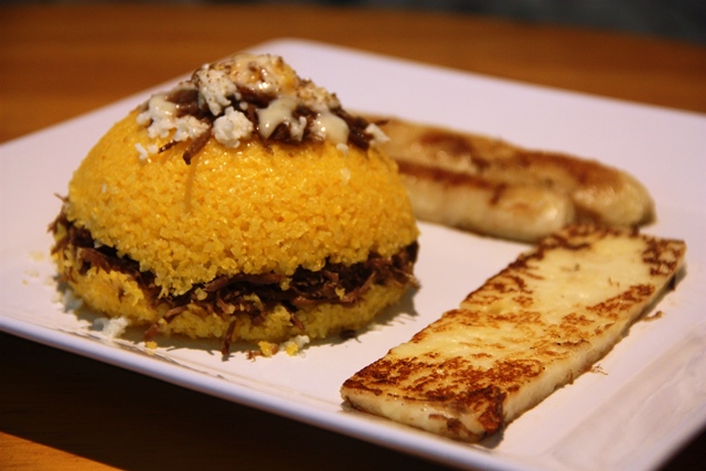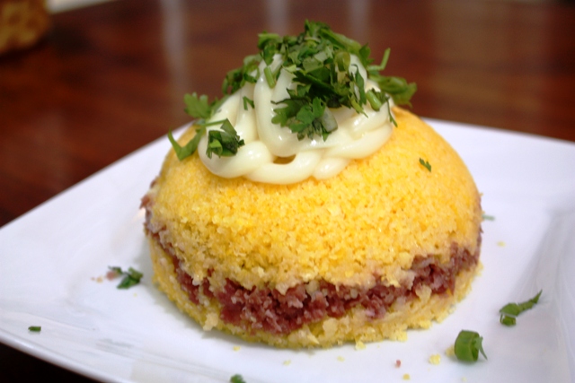 Cuscuz recheado com carne de sol, queijo coalho e banana do Recanto da Macaxeira
