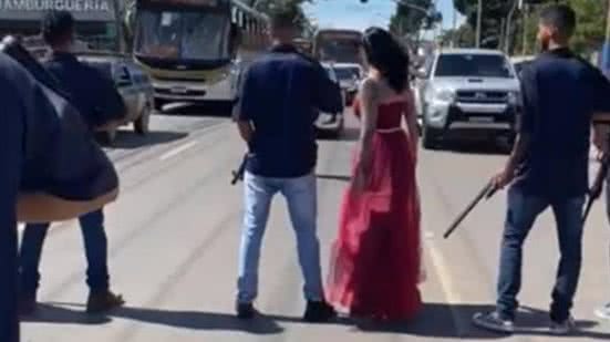 Nesta quarta-feira (23/2), a PCDF apreendeu oito armas que foram utilizadas pelos envolvidos. No vídeo que circula nas redes, a mulher aparece desfilando com um vestido de festa no meio da rua, rodeada por homens que seguram armas. No momento, para a tradicional “foto”, os envolvidos decidem formar uma barreira e parar o trânsito na via. A situação teria sido organizada para registros da prévia de casamento entre a mulher e um homem.
