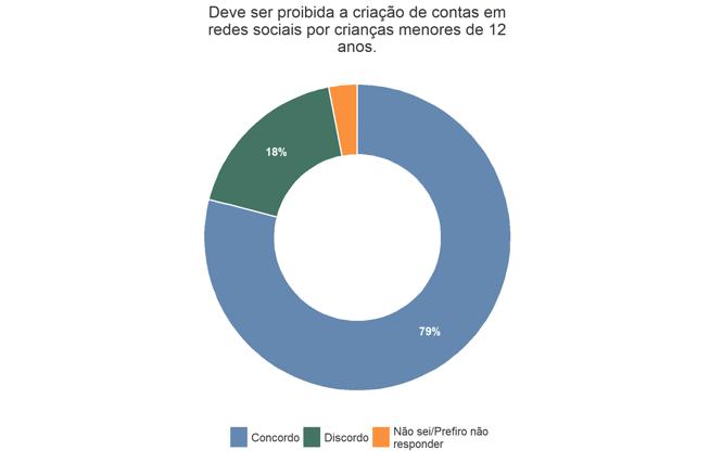 De acordo com o projeto, os provedores de produtos e serviços digitais devem criar mecanismos de verificação de idade dos usuários. Quando perguntados sobre a idade mínima para criar contas nas plataformas digitais, os participantes, em sua maioria (79%), concordam com a proibição do uso de redes sociais por menores de 12 anos.