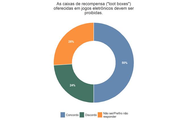 O projeto propõe também a proibição das caixas de recompensa, conhecidas como loot boxes, ou seja, aquelas gratificações que podem ser adquiridas com moedas virtuais de jogos ou pagas em dinheiro. Nesse aspecto, a opinião dos respondentes se divide: 50% concordam com a proibição dessas caixas de recompensa, 24% discordam e 26% disseram que não sabem ou preferiram não responder.