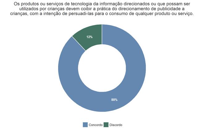 Em relação à publicidade em plataformas digitais voltadas ao público infantil, a maioria dos participantes (88%) acredita que deve ser coibida a prática do direcionamento de publicidade a crianças, com a intenção de persuadi-las para o consumo de qualquer produto ou serviço.