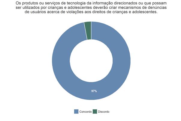 De acordo com a enquete, maioria dos internautas (97%) concorda que os produtos ou serviços de tecnologia da informação direcionados ou que possam ser utilizados por crianças e adolescentes deverão criar mecanismos de denúncias de usuários acerca de violações aos direitos de crianças e adolescentes.