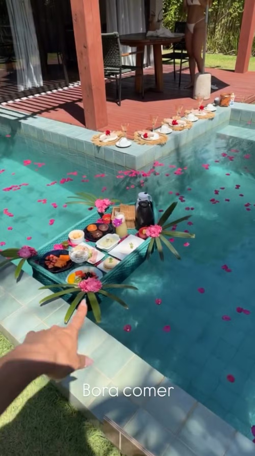 Tainá Militão, de 31 anos, mostrou na manhã desta quinta-feira (11) que desfrutou de um café da manhã luxuoso. A influenciadora, que é casada com o jogador de futebol Eder Militão, de 27, está curtindo uma viagem por São Miguel dos Milagres, em Alagoas. Nos Stories do Instagram, ela mostrou que o café foi posto em um barquinho em uma piscina privativa