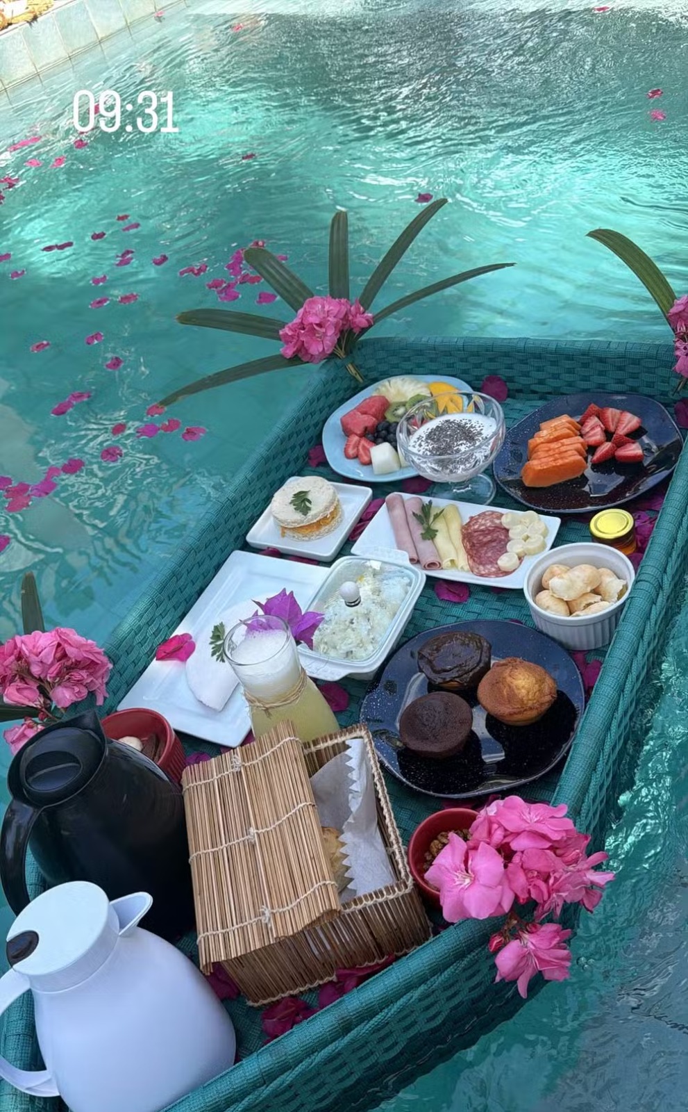 O café da manhã incluía uma variedade de itens como frutas, doces e bebidas, tudo decorado com flores, criando um ambiente encantador que chamou a atenção dos seguidores.