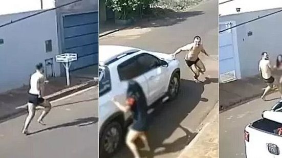 A gravação mostrou o homem correndo apenas de cueca e a arrastando a companheira pelo braço. Em seguida, um carro parou ao lado do casal e cinco passageiros desceram para ajudar a vítima, que entrou no veículo.