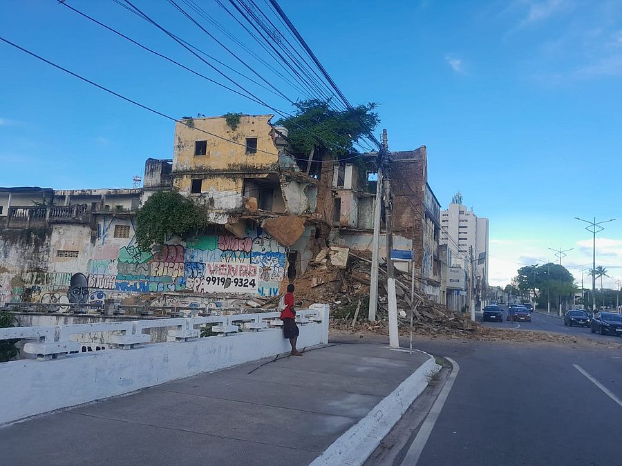 Desabamento e determinação de demolição - A Defesa Civil de Maceió vai realizar, nesta segunda-feira (22), a demolição do restante da estrutura do prédio que desabou, no bairro de Jaraguá, próximo ao Riacho Salgadinho, durante a tarde desse domingo (21). O local foi isolado e um trecho da Avenida da Paz foi interditado pelo DMTT (Departamento Municipal de Transportes e Trânsito).