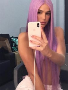 Isso porque a atriz fez uma foto no espelho onde aparece fazendo topless. Os seios foram tapados apenas pelas longas madeixas de uma peruca rosa que ela estava usando (veja abaixo).