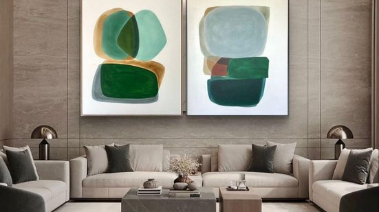 Azuis profundos, verdes-musgos e variações minerais surgem como contraponto à velocidade do cotidiano. Nas obras autorais, essas cores funcionam como campos de contemplação, especialmente em salas amplas e áreas sociais que pedem equilíbrio visual.