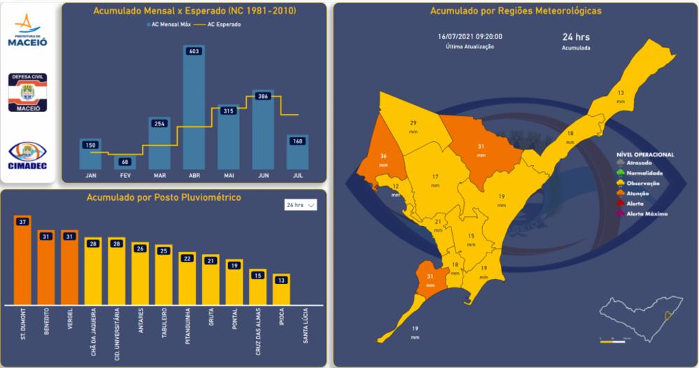 As equipes de Defesa Civil estão trabalhando em nível operacional de atenção, dentro do Protocolo de Proteção e Ação da Defesa Civil de Maceió, devido o aviso meteorológico emitido pela Sala de Alerta da Secretaria de Estado do Meio Ambiente e dos Recursos Hídricos (Semarh), que orienta sobre chuva com intensidade fraca a moderada e de forma contínua, que podem gerar acumulados significativos, durante todo o dia de hoje.