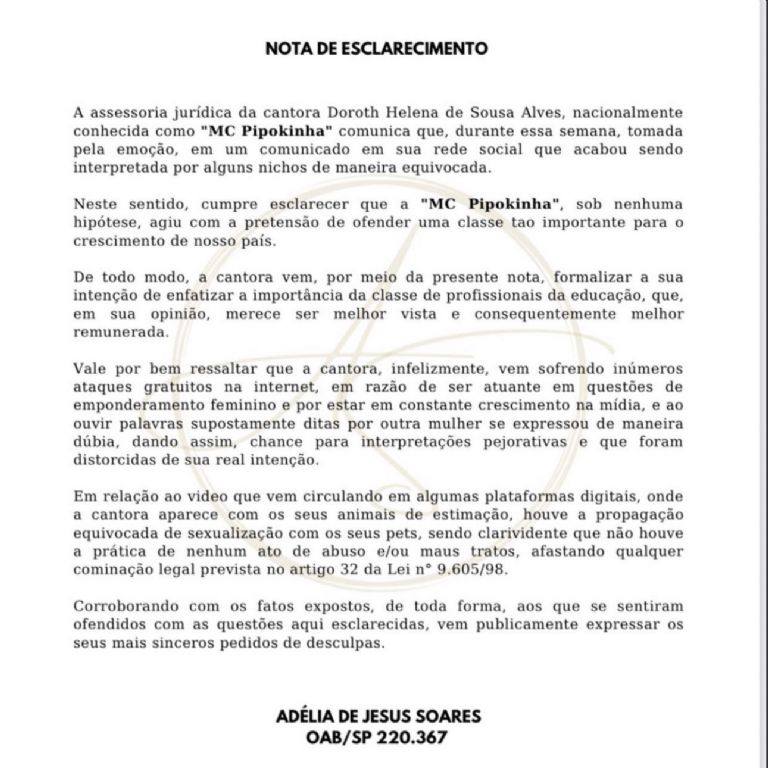 Na tentativa de conter a crise, a advogada de MC Pipokinha, Adélia de Jesus Soares, divulgou na noite desta sexta-feira (10) um comunicado afirmando que a funkeira "não agiu com a pretensão de ofender" os professores e negando que a cantora tenha praticado zoofilia.