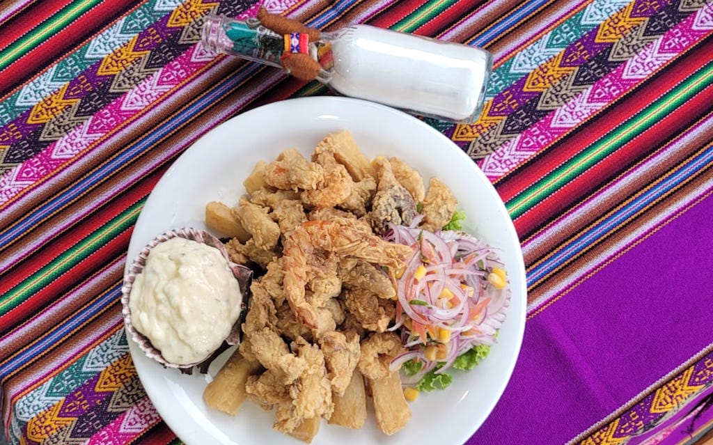 Jalea mixta são os camarões, polvo, lula, e filé de peixe temperados em especiarias peruanas e empanados
