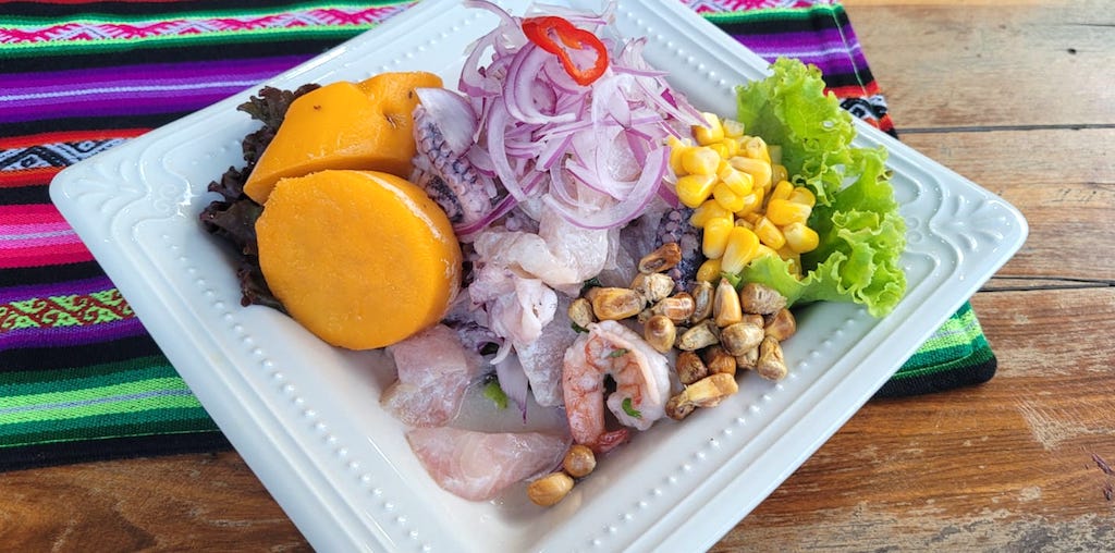 Ceviche Mixto com filé de peixe branco fresco, camarões, polvo e lula