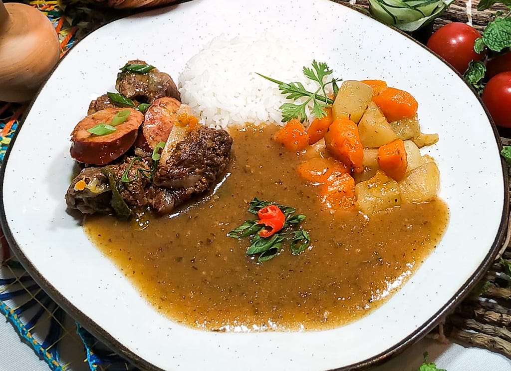 O cozido vem com o pirão e legumes (cenoura, batata, chuchu, couve e repolho). Já a carne escolhida é acém, porque, segundo a chef, tem menor teor de gordura e aguenta maior tempo de pressão e fervura. De fato a troca do chambaril pelo acém não alterou a tradição.