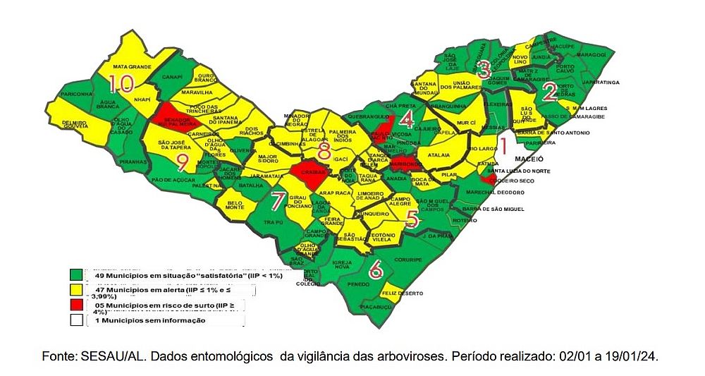 O Levantamento de Índice Rápido para o Aedes aegypti, uma metodologia que permite o conhecimento de forma rápida por amostragem da quantidade de imóveis com a presença de recipientes com larvas de Aedes aegypti, registrou, no período de 2 a 19 de janeiro, que as cidades de Senador Rui Palmeira, Paulo Jacinto, Maribondo, Coqueiro Seco e Craíbas estavam em risco de surto (de cor vermelha no mapa abaixo), com índice de infestação predial (IIP) igual ou maior do que 4%.