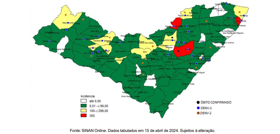 Já referente às últimas quatro semanas, as cidades de Atalaia, Santana do Mundaú e Japaratinga apresentaram alta incidência de casos, enquanto 11 (Mata Grande, Viçosa, Olivença, Igaci, Palmeira dos Índios, Santana do Ipanema, Mar Vermelho, Jaramataia, Carneiros, Maragogi e São José da Laje) notificaram casos prováveis, mas ficaram na média.