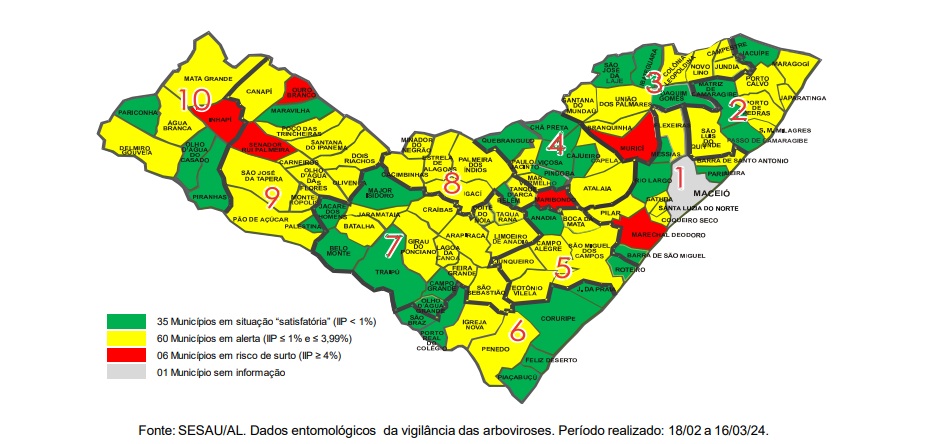 Abaixo, você pode conferir o gráfico fornecido pela Sesau que mostra os locais que estão próximos ao surto da doença (de cor vermelha), as 60 cidades em alerta (de cor amarela), com o IIP entre 1% e 3,99%, e os 35 municípios que consideram a situação satisfatória, com o índice menor do que 1%. Apenas Maceió não passou informações para a Sesau.