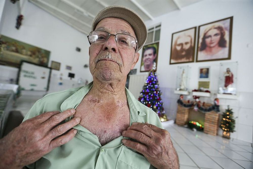Joaquim Pedro de Menezes mostra cicatrizes de cirurgia espiritual para cura de um câncer na garganta. Foto: Agência Brasil |