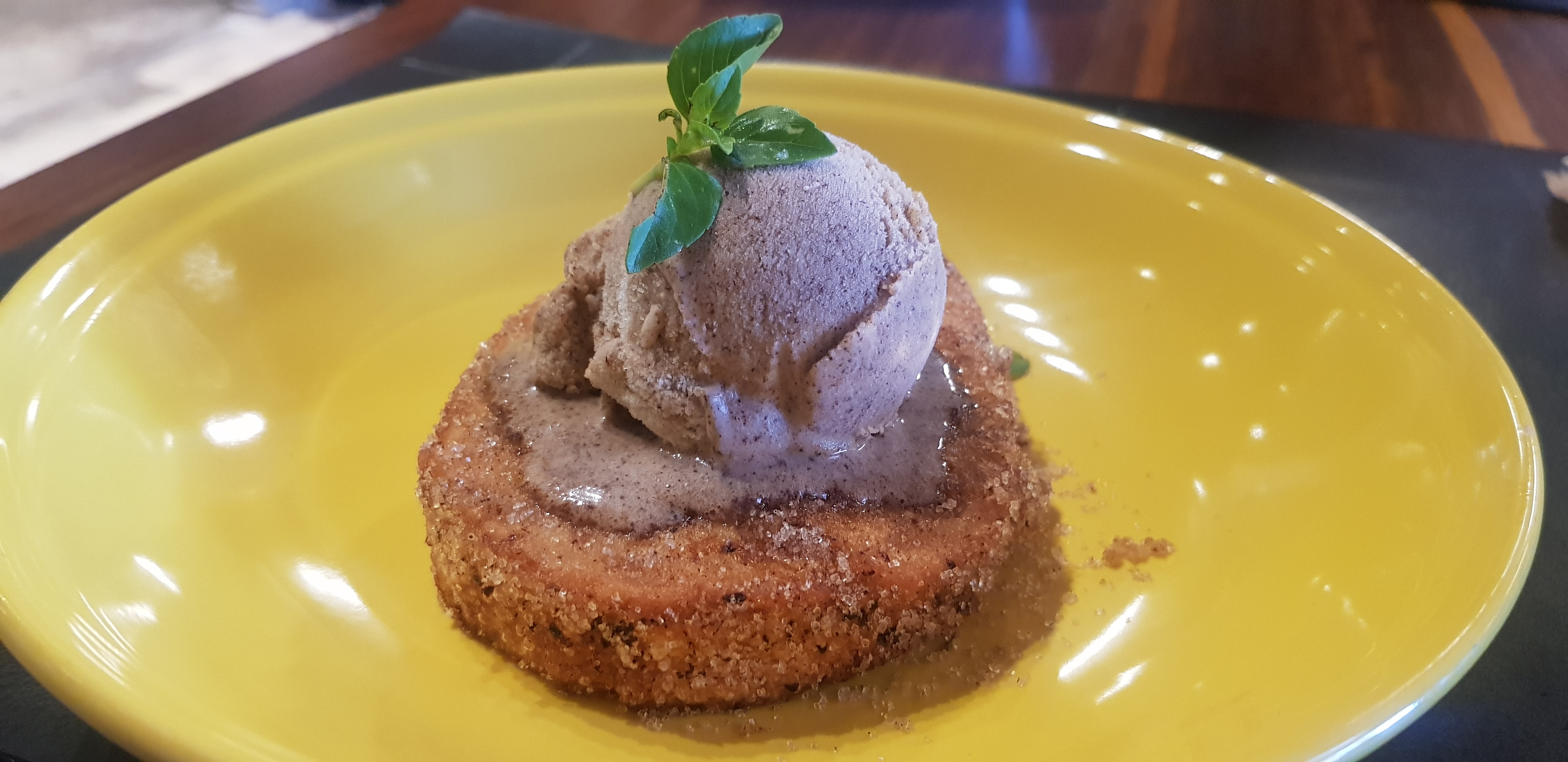 Toscana: A rabanada do restaurante é feita da forma tradicional, com torrada de pão adormecido, leite condensado, ovos, canela, açúcar, e chega à mesa com sorvete de canela (bem suave), produção da casa, eu simplesmente amei. Como a sobremesa está agregada ao almoço executivo, apostei nas lembranças natalinas, de entrada o pastel de festa (com recheio de carne e polvilhado com açúcar) e prato principal, salpicão de frango.