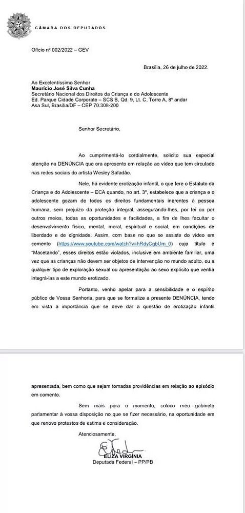Ao tomar conhecimento da viralização do vídeo, a deputada federal Eliza Virgínia (PP) denunciou o cantor a Maurício José Silva Cunha, Secretário Nacional dos Direitos da Criança e do Adolescente. "Ficamos horrorizados. Minha bandeira é lutar contra a exploração sexual e o abuso infantil. E, no vídeo, o Wesley Safadão canta e dança com a filha de oito anos uma letra de música que fala sobre sexo explícito. Ele faz apologia à pedofilia. As crianças assistem ao vídeo e querem dançar também. Às vezes os pais nem prestam atenção às letras das músicas. Hoje em dia, tem criança que não sabe ler nem escrever, mas já sabe falar sobre sexo. Isso não pode ficar assim. As crianças estão sendo erotizadas", afirma.