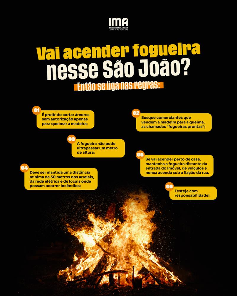 O Instituto do Meio Ambiente do Estado de Alagoas (IMA/AL) alerta à população para que não derrube árvores indevidamente com o objetivo de fazer fogueiras. O órgão esclarece que existem regras e recomendações para que essa prática não se torne uma infração ambiental.
