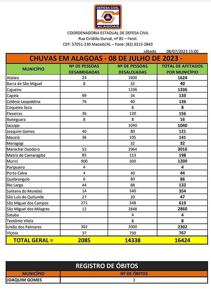A Defesa Civil atualizou o número de desabrigados e desalojados em Alagoas na tarde deste sábado, 8. O estado agora tem 16.424 pessoas afetadas pelas fortes chuvas, sendo 2.085 delas desabrigadas, e 14.338, desalojadas, de acordo com o boletim divulgado às 15h. Ao todo, 27 cidades estão com moradores atingidos pelo período chuvoso nas últimas horas.