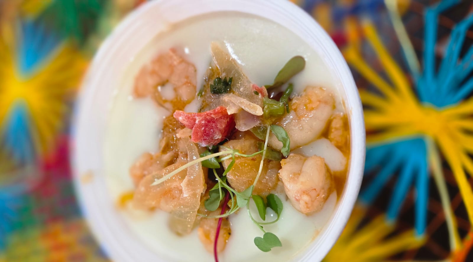 Dona Nia é minha mãe. O camarão dela sempre foi simples e cheio de sabor: tomate, cebola, pimentão, coentro e pimenta, tudo refogado na manteiga. Para escoltar essa tradição, o mingaupitinga que ela sempre fazia para acompanhar pescados — na receita, massapuba e leite de coco, até alcançar a textura de mingau.