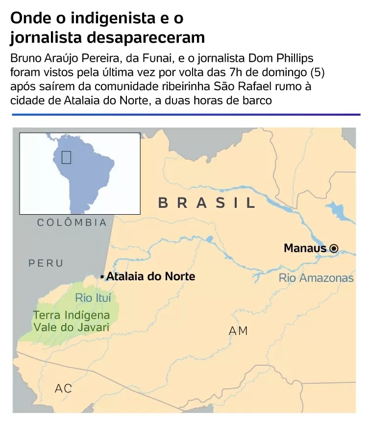 A equipe de busca e salvamento vasculha os rios Javari, Itaquaí e Ituí desde segunda-feira (6). Sete militares da Capitania Fluvial de Tabatinga (AM), duas lanchas, uma moto aquática e um helicóptero estão sendo usados nos trabalhos, segundo a Marinha.