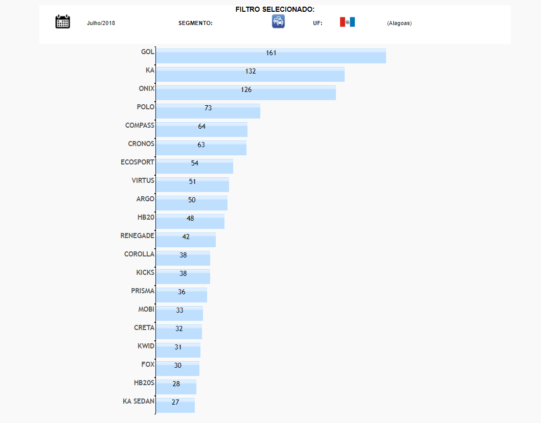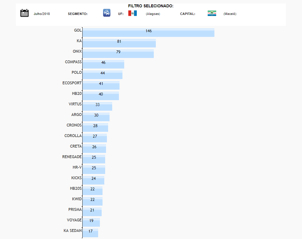 A vitória do Gol em Alagoas foi ampla, com 29 unidades a mais que o Ford Ka, que ficou na segunda posição e 35 a mais que o Onix. O Gol emplacou 161 unidades, o Ka 132 e o Onix 126.