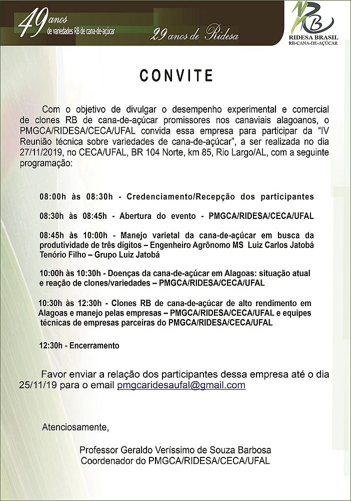 A Reunião terá início a partir das 8h, com o credenciamento e a recepção dos participantes. A programação do evento conta com a abertura, às 8h30, e com três palestras, intituladas Manejo varietal da cana-de-açúcar em busca da produtividade de três dígitos, Doenças da cana-de-açúcar em Alagoas: situação atual e reação de clones/variedades, Clones RB de cana-de-açúcar de alto rendimento em Alagoas e manejo pelas empresas.